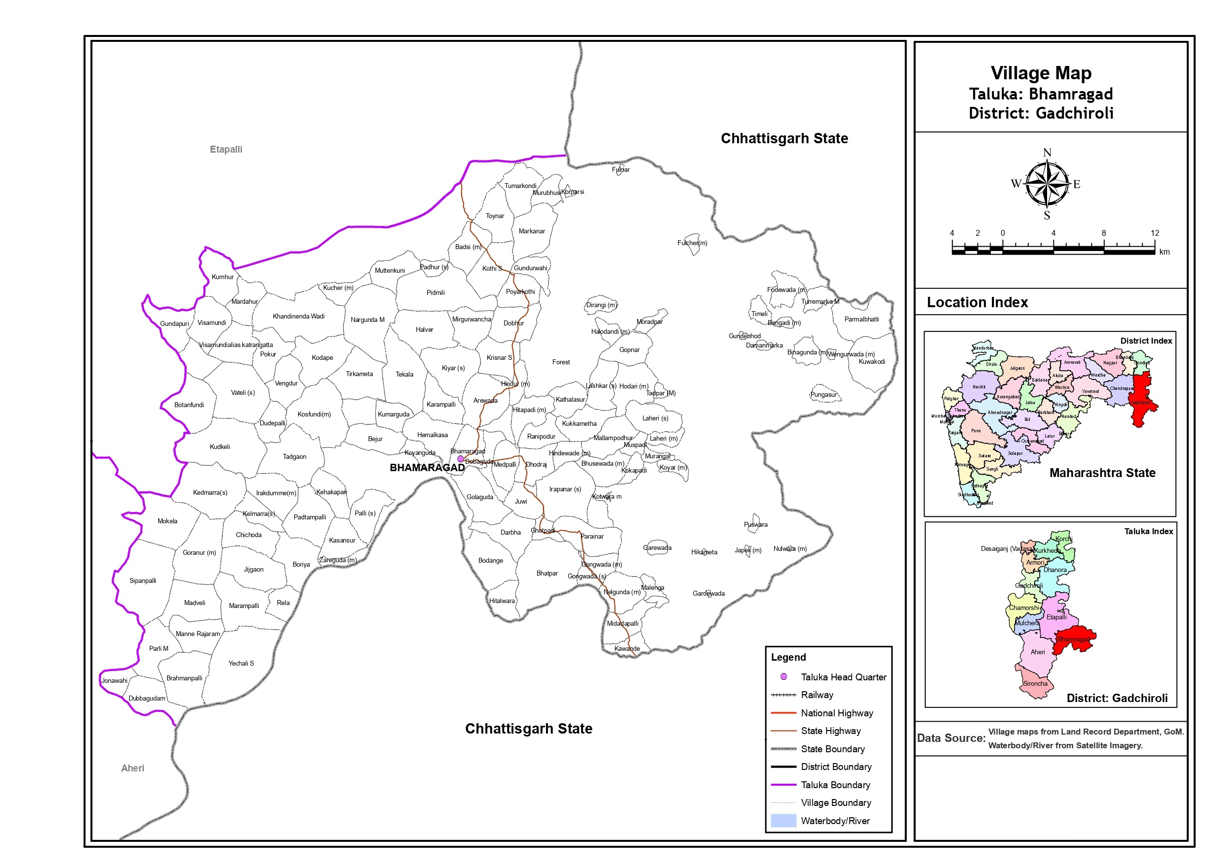 गावे :- 2011 जनगणने नुसार एटापल्ली तालुक्यात एकुण 197 गावे असुन सर्व गावात वस्ती करुन लोक राहतात. तर भामरागड तालुक्यात एकुण 128 गावे असून 126 गावांमध्ये लोक वस्ती करुन राहतात व 2 गावे अद्याप ओसाड आहेत.